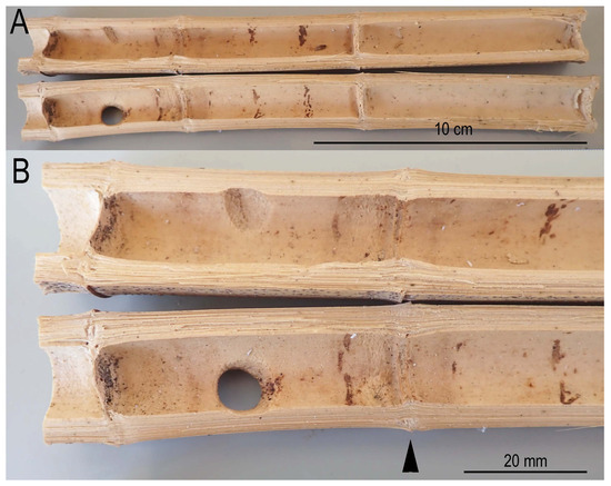 The bee removed a septa wall (diaphragm) between two short internode sections to utilize them as an expanded nest volume. (A) Transverse section of three internodes; (B) close-up of node (arrowhead) where the diaphragm was removed by the bee to expand into the adjacent internode.