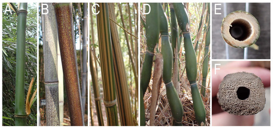 Culm morphology of several bamboo species. (A) Phyllostachys bambusoides with green culm without special pattern. (B) P. nigra f. punctata with brownish surface. (C) Bambusa multiplex f. alphonso-karri with striped pattern on culm surface. (D) Pseudosasa japonica var. tsutsumiana culm consisting of elongate pear-shaped sections. (E) Circular cross-section of P. bambusoides culm. (F) Cross-section of Tetragonocalamus quadrangularis culm with roundish square shape.