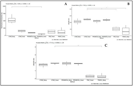 Concerning the purity of the extracted total nucleic acid calculated by the 260/280 (Figure 1B) and 260/230 ratios (Figure 1C) (indicating contamination by proteins and phenolic compounds, respectively), a significant difference (p = 0.0035 and p = 0.0042, respectively) was observed among samples, resulting in two homogeneous groups: one including the TRIzol/head and TRIzol/body combinations, and the other one the remaining combinations.