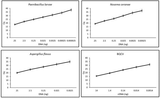 Standard curves for the four pathogens were designed, using 10-fold DNA/cDNA dilutions in qPCR reactions (Figure 3). For N. ceranae, the standard curve had a slope of −3.560, a y-intercept of 24.373 (R2 = 0.998), and an efficiency of 90.9%. The primer pair was able to efficiently amplify up to 250 fg of target DNA (corresponding to 30 cells). For P. larvae, the standard curve had a slope of −3.197, a y-intercept of 22.563 (R2 = 0.997), and an efficiency of 105.5%. The primer pair efficiently amplified up to 25 fg of target DNA (corresponding to 5 cells). The A. flavus standard curve had a slope of −3.406, a y-intercept of 25.970 (R2 = 0.999), and an efficiency of 96.6%. The primer pair was able to efficiently amplify up to 2.5 pg of target DNA (corresponding to 66 cells). For BQCV, the standard curve had a slope of −3.370, a y-intercept of 27.711 (R2 = 0.982), and an efficiency of 98.0%. The primer pair was able to efficiently amplify up to 5 pg of target cDNA.