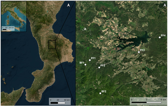 Sampling areas on the Sila plateau, Calabria (southern Italy). On the right are the sampling areas (QGIS Desktop 3.44.1).