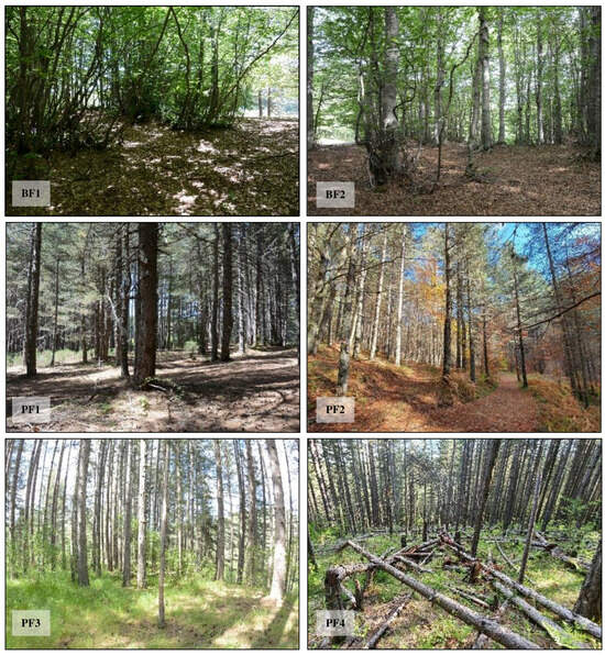 BF1 (39°20′19.4″ N, 16°23′50.3″ E) is located at 1580 m above sea level in the locality of Vette (Moccone municipality). The forest is predominantly composed of Fagus sylvatica L., with occasional specimens of Abies alba Mill. BF2 (39°17′13.0″ N, 16°25′55.8″ E) lies at 1820 m above sea level and is accessible only via the Vette area. It consists mainly of Fagus sylvatica, with a few scattered Abies alba trees. PF1 (39°20′48.6″ N, 16°24′27.5″ E) is situated at 1425 m above sea level near the locality of Fago del Soldato (Celico municipality). This forest is dominated by Pinus nigra, with a few Fagus sylvatica individuals. The understory includes Erica arborea L. and Spartium junceum L. and features numerous Standing Dead Trees and a significant amount of Fine Woody Debris on the forest floor. PF2 (39°20′01.0″ N, 16°25′47.0″ E) is located at 1320 m above sea level in the Camigliatello Silano municipality. This pine forest is dominated by Pinus nigra, with the presence of some Fagus sylvatica L. and Populus alba L. individuals.