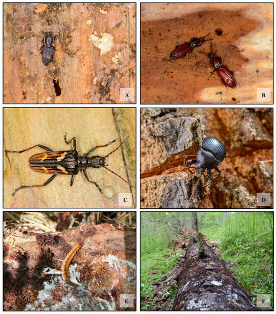 Photos of selected saproxylic beetles. (A) Pycnomerus italicus, (B) Clinidium canaliculatum, (C) Rhagium bifasciatum, (D) Enoplopus dentipes, (E) larva of Cucujus cinnaberinus and (F) woody necromass.