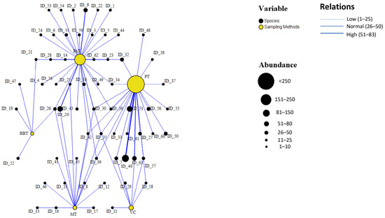 In the relationship graph, interactions between the different sampling traps (represented by yellow nodes) and the captured species (black nodes) are visualized. The size of each node is proportional to the total number of captures, while each line (edge) connects a trap to a species. The thickness of the line indicates the strength of the association, i.e., the abundance of captures made by a given trap. The traps include Bait Bottle Traps (BTs), Pan Traps (PaTs), Malaise Traps (MTs), Pitfall Traps (PTs), and Visual Census (VC). The graph was generated using SPSS software version 29.0.1.0.