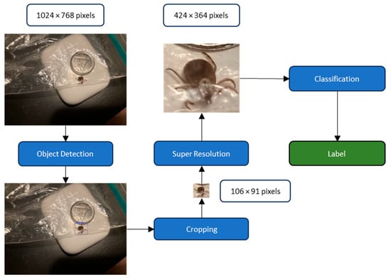 The general methodology can be summarized as follows. An object detection model first locates the tick in the picture, and the image is then cropped around the tick. A super-resolution GAN subsequently enhances the cropped image before a classification model assigns an identification label to the tick (Figure 2).