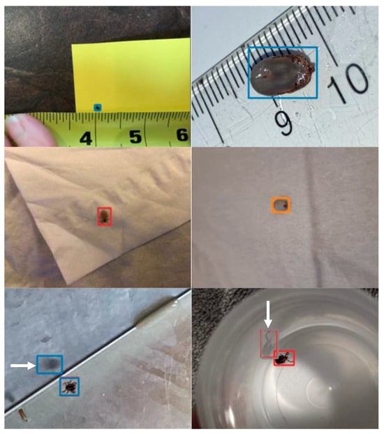 Initially, we attempted to train the model using all 17 classes defined in our dataset (Table 1), which include fine distinctions between species, and dorsal/ventral views. However, this level of taxonomic granularity proved unrealistic for an object detection task, given the relatively small size of the tick in the 640 × 640 resized images. The downscaling process caused the loss of many of the fine morphological details required to distinguish between species and stages, making such a classification problem unfeasible at the detection stage. As a result, the model struggled to classify the ticks correctly among the 17 classes, achieving a low macro-averaged F1-score of only 59.2%. To overcome this limitation, we reframed the task: rather than using object detection to classify the tick species, we simplified the detection step to a single “tick” class, independent of species or stage. This approach allowed the model to focus solely on localizing the tick in the image without having to resolve fine taxonomic differences lost during image resizing. With this simplification, the detection performance drastically improved, achieving a macro-averaged F1-score of 99.5%, demonstrating that YOLOv7 is highly effective at detecting the presence of a tick, even if species-level classification requires a separate, higher-resolution step. Interestingly, several instances of false positives for detection involved reflections of ticks being detected as ticks (Figure 3).