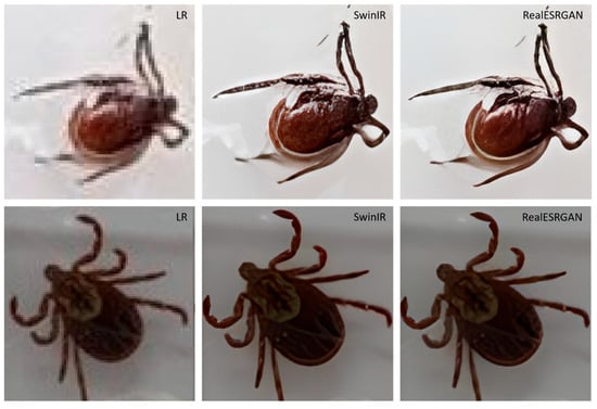Since no actual ground truth is available for our specific task, and creating a task-specific training dataset is beyond the scope of our work, we decided to visually evaluate the results of the two architectures, RealESRGAN and SwinIR. Although visual assessment is inherently subjective and lacks the precision of quantitative metrics, it offers a pragmatic solution in the absence of ground truth. This approach allows experts in the field of tick identification to use their knowledge to make informed judgments about the quality of the reconstructions. While not ideal, this evaluation method provides a basis for assessing the performance of the super-resolution models and guides our decision-making process in selecting the architecture that produces the most realistic and detailed images.