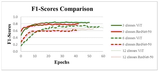 Comparison of F1-score performance between Vision Transformer (ViT) and ResNet-50 models for classification tasks with 3, 6, and 12 classes. The curves represent the evolution of F1-scores over training epochs. The results indicate that ViT outperforms ResNet-50.