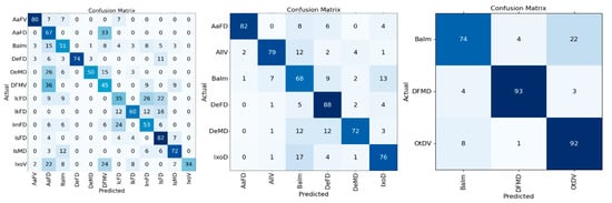 All of our datasets exhibited class imbalance, which inherently complicates model training by skewing the learning bias towards more populous classes. The impact of this imbalance on F1-scores, particularly for models burdened with a higher number of classes, remains a crucial area of inquiry. The analysis of confusion matrices at different levels of class granularity (Figure 6) allowed us to further investigate class-level performance and performance/granularity trade-offs. The 12-class matrix yielded an average correct classification of 59%, with some classes (AaFV, DeFD, IsFD, IsMD) predicted with over 70% recall while others (Dermacentor V, IcFD, IxoV) showed less than 50% recall and high inter-class confusion. Regrouping into 6 classes increased the overall recall by 17.5% points to 77.5%, with five out of six classes exceeding 70% recall. BaIm (Bad image) had the lowest recall with 68%. Further regrouping into 3 classes achieved an 86.3% recall (an additional 8.8 point gain) and over 90% recall for DFMD and OtDV. The lowest score was again observed in the BaIm class (74%). Unlike all others, “Bad Image” is a class with a broad subjective definition that is open to interpretation. It is characterized by blurring, poor contrast, suboptimal angles, and/or incomplete tick representation often due to obstruction by other components of the image, leading to high rates of misclassification.