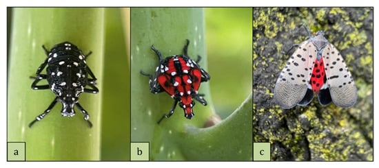 (a) 3rd instar, (b) 4th instar and (c) adult spotted lanternfly.