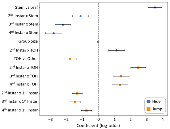 Instar stage demonstrated differential effects on behavior choice. Relative to 1st instars, all later developmental stages showed significantly reduced jumping behavior: 2nd instars (β = −1.32, SE = 0.31, z = −4.23, p < 0.001, OR = 0.27), 3rd instars (β = −1.46, SE = 0.32, z = −4.55, p < 0.001, OR = 0.23), and 4th instars (β = −0.75, SE = 0.32, z = −2.33, p = 0.020, OR = 0.47). Main effects of instar on hiding behavior were not statistically significant (p > 0.05)