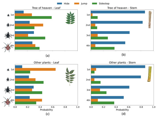 Predicted probabilities of each antipredator behavior on (a) leaves of tree of heaven, (b) stems of tree of heaven, (c) leaves of other plants, and (d) stems of other plants.