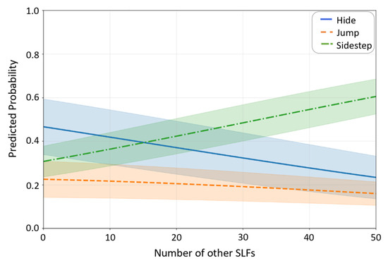Overall effect of the number of other SLF nymphs within a 10 cm radius on predicted probabilities for each antipredator behavior, averaged across all developmental stages, tree categories, and microhabitats. The shaded ribbons represent 95% confidence intervals around each prediction.