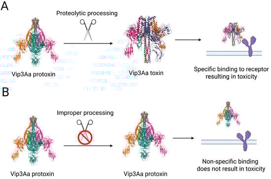 Conceptual model illustrating resistance due to lack of Vip3Aa protoxin processing. The processing of Vip3Aa protoxin in susceptible insects (A) is interrupted in resistant insects (B), resulting in a lack of effective binding to receptors (i.e., conducive to insertion) on the midgut membrane. Distinct structural domains in the Vip3Aa protoxin and toxin structures are shown with different colors.