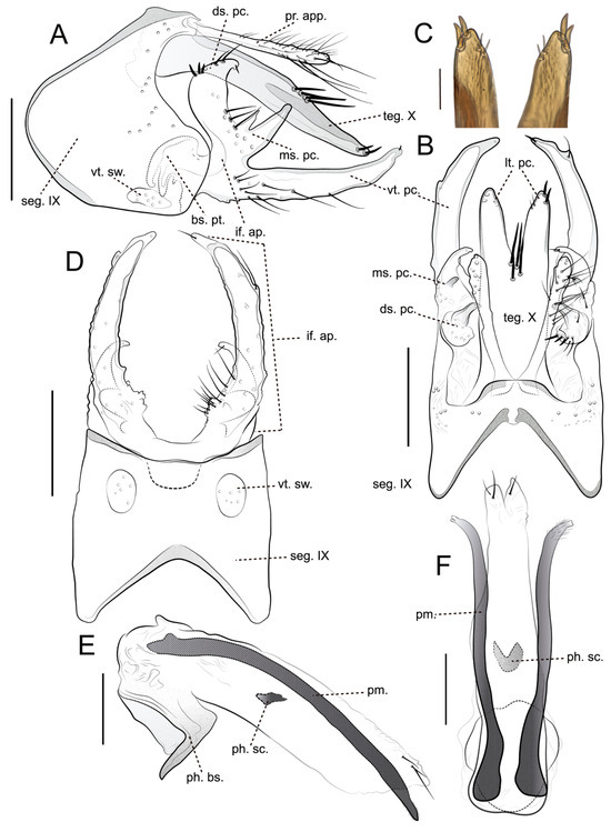 Male genitalia: Segment IX, in lateral view, subtriangular, with anterodorsal margin almost straight; anteromesal margin convex, rounded, strongly produced; anteroventral margin straight; posterior margin produced basally, bearing apex truncated (Figure 3A); in dorsal view, anterior margin with shallow, wide V-shaped mesal incision, strongly sclerotized band extending posteriorly, but not touching the posterior margin; posterior margin produced mesally and straight (Figure 3B); in ventral view, anterior margin with wide V-shaped mesal incision; posterior margin slightly concave, bearing a pair of large, rounded setal warts (vt. sw.) (Figure 3D). Preanal appendages (pr. app.) originating dorsomesally, setose, slender, digitate, about 3/4 length of tergum X in lateral and dorsal views (Figure 3A,B); in dorsal view, apex rounded, bearing long, thin setae (Figure 3B). Tergum X, in lateral view, narrowing apically, apex rounded (Figure 3A); in dorsal view, bearing four long, stout setae grouped at mid-length; divided by V-shaped apicomesal incision extending anteriorly about 2/3 length of the segment, originating pair of paired lateral process (lt. pc.) (Figure 3B); each lateral process (lt. pc.) slender, bearing one pair of short, stout subapical setae on mesal margin and one pair of medium-sized, stout apicolateral setae, apex rounded (Figure 3B,C). Inferior appendage (if. ap.), in lateral view, setose, base broad, divided into three processes of unequal length (Figure 3A); dorsal process (ds. pc.), in lateral and dorsal view, hook-like, medium-sized, curved mesad, apex rounded and directed mesad, bearing numerous short, stout dorsal setae (Figure 3A,B); mesal process (ms. pc.), in lateral view, bifid, with digitate lobes of unequal length (Figure 3A); in dorsal view, directed mesad (Figure 3B); ventral process (vt. pc.), in lateral and dorsal view, slender, very long, surpassing tergum X, narrowing apically slightly curved dorsad, apex rounded and directed posteromesad (Figure 3A,C); in ventral view, basomesal margin crenulate, without projections or lobes, covered by numerous long, thin setae (Figure 3D); basal plate (bs. pt.), in lateral view large, trough-like (Figure 3A). Phallic apparatus, in lateral view, tubular, almost straight along its length; phallobase large, shoe-shaped in lateral, ventral margin strongly sclerotized; endothecal membranes striate apicodorsally, apex bifid, with three medium-sized, thin setae; endothecal spines absent; parameres present, paired, slender, strongly sclerotized, as long as phallic apparatus; apex slightly bifid, covered by numerous short, thin setae, directed posteroventrad in lateral view and posterolaterad in dorsal view; phallotremal sclerite (ph. sc.) well-developed, comma-shaped in lateral view and U-shaped in dorsal view (Figure 3E,F).