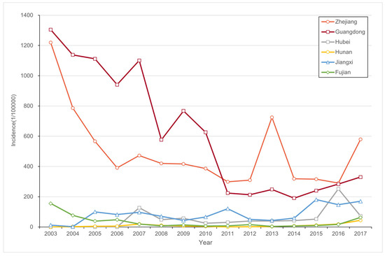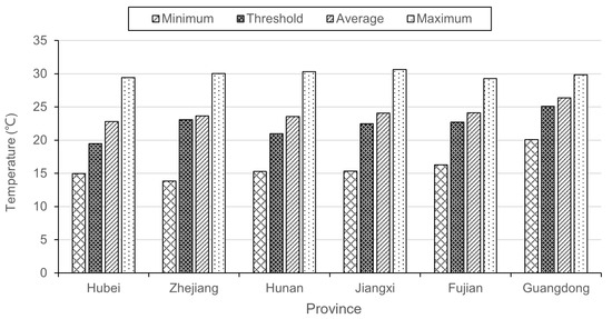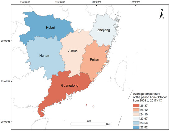 Meteorological data from April to October each year between 2003 and 2017 were obtained. The daily meteorological data is sourced from the China Meteorological Data Center (http://data.cma.cn/, accessed on 1 March 2021) and includes information reported by 118 meteorological stations within the study area. The dataset comprises various elements, such as average temperature, precipitation from 20:00 to 20:00 (+1), average relative humidity, average 2 min wind speed, and sunshine duration; we use the average temperature in the formal analysis of following sections. First, outliers exceeding two times the standard deviation from the mean were removed from the dataset to ensure data quality. Furthermore, the meteorological parameters for each province were formed through interpolation to supplement missing values by second-order polynomial fitting, and the monthly average value was calculated. The monthly average temperatures of every province in our study area were formed, including Hubei, Zhejiang, Hunan, Jiangxi, Fujian, and Guangdong.