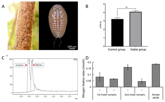 Nitrogen fixation ability of E. pela. (A) Nymphs of E. pela aggregating on branches. (B) Quantification of 15N content reveals that viable controls (left) exhibit a significantly higher 15N content than ethanol-treated controls (right) following exposure to isotope-labeled 15N nitrogen gas (p < 0.01 (**)). (C) Gas chromatography (GC) traces showing acetylene and ethylene peaks during the acetylene reduction assay. (D) Nitrogen fixation rates of E. pela across different life stages.