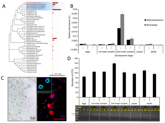 To identify symbiotic bacteria with a potential role in nitrogen fixation, we conducted high-throughput sequencing on the microorganisms released from tissues of E. pela. This analysis revealed 42 species of nitrogen-fixing bacteria, with Rhizobiales and Methylobacterium emerging as the dominant bacterial species (Figure 2A). Importantly, both bacterial taxa were detectable from the embryonic stage through to adulthood (Figure 2B), suggesting a potential obligate symbiotic relationship acquired through vertical transmission.