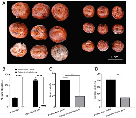 Effects of removing nitrogen-fixing bacteria in female E. pela. (A) Size difference between female adult treated with distilled water (left) and tetracycline (right). (B) The absolute abundance of nitrogen-fixing bacteria in female adult E. pela treated with distilled water was significantly higher than that in those treated with tetracycline (p < 0.0001 (****)). (C) The survival rate of females without removal of symbiotic bacteria was significantly higher than that in females with removal of symbiotic bacteria (p < 0.01 (**)). (D) The individual weights of females without removal of symbiotic bacteria were significantly higher than that in females with removal of symbiotic bacteria (p < 0.01 (**)).
