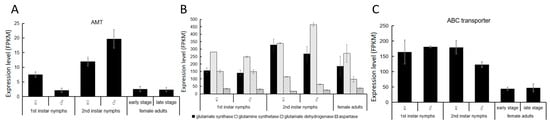 Previous studies demonstrate that the ABC transporter is pivotal in transporting amino acids between cells in both bacteria and eukaryotes [29,30]. Indeed, we also observed elevated levels of the ABC transporter transcript in all developmental stages of E. pela, particularly in the nymphs (Figure 4C), which mirrors their considerable need for amino acids intake to support their growth.