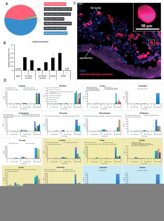 The abundance and distribution of Ophiocordyceps in E. pela. (A) Taxonomic composition of seven Ophiocordyceps species detected in E. pela. (B) Dynamic changes in Ophiocordyceps relative abundances across larval–pupal–adult developmental stages. (C) Localization of Ophiocordyceps sinensis in host fat body tissues. (D) Expression levels of enzyme genes involved in the amino acid synthesis of O.sinensis and E. pela. The expression patterns of 62 enzyme-coding genes involved in 20 essential amino acid synthesis pathways in different instars of O. sinensis. White boxes: Amino acids not synthesized by E. pela (complete metabolic dependence). Yellow boxes: Partial enzymatic capacity in E. pela (symbiosis-dependent biosynthesis). Blue boxes: Amino acids fully synthesized by E. pela (host-autotrophic production). Data are presented as the mean ± standard deviation (SD, n = 3).