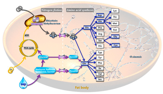 Based on the above evidence, we present a nitrogen cycling model for E. pela (Figure 6) comprising the following sequential processes: (1) atmospheric nitrogen (N2) enters the insect’s respiratory system through spiracles; (2) N2 diffuses into the insect’s tracheal system and is subsequently transported via tracheal capillaries to fat body cells; (3) within these fat body cells, symbiotic Rhizobiales and Methylobacterium strains mediate enzymatic nitrogen fixation, converting N2 to ammonia (NH3); (4) the resulting NH3 undergoes hydration to form ammonium ions (NH4+), serving as a critical precursor for amino acid biosynthesis.