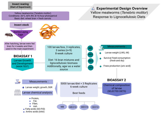 where w1: initial weight of 30 larvae at time t1, w2: final weight of 30 larvae at time t2, and Δt: time difference between t1 (start of the experiment) and t2 (end of the experiment) expressed in days. The schematic layout of bioassay 1 is shown in Figure 1.