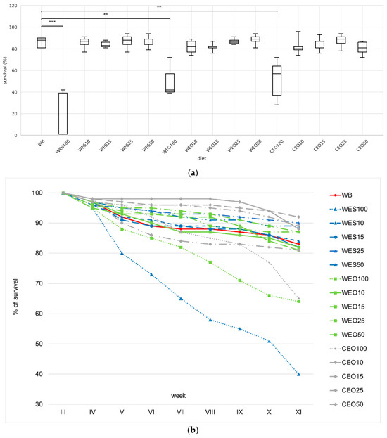 Survival of yellow mealworm larvae depending on the diet (a) and week (b). Kruskal–Wallis test: asterisks above brackets indicate significant differences between the compared groups: * p < 0.05, ** p < 0.01, *** p < 0.001. Diet abbreviations: WB: wheat bran; WES10-WES100: wheat bran mixed with enzymatically hydrolysed wheat straw pretreated with steam explosion; WEO10-WEO100: wheat bran mixed with enzymatically hydrolysed wheat straw pretreated using the organosolv method; CEO10-CEO100: wheat bran mixed with enzymatically hydrolysed cup plant pretreated using the organosolv method. The number following each abbreviation indicates the percentage content of the pretreated lignocellulosic material in the diet (in mixtures with wheat bran).