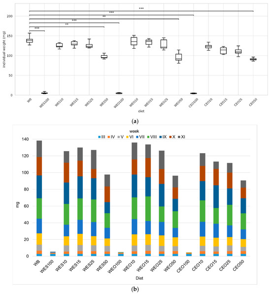 The type of feed mixtures used significantly affected the final individual larval weight compared to the control (Figure 3a). Larvae reared on the control diet had the significantly highest weight (138.7 mg). All larvae fed diets containing 10–25% lignocellulosic material did not differ significantly in weight, which ranged from 109.3 to 136.1 mg for CEO25 and WEO15, respectively. A significant decrease in insect weight was already observed in mixtures containing 50% lignocellulosic materials (90.7–94.9 mg for CEO50 and WES50, respectively). In contrast, insects fed solely on lignocellulosic material showed almost no growth, and their weight gain over the course of the experiment was also minimal (Figure 3b, Table S1).