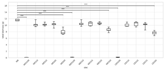 The total biomass of larvae depending on the diet. Kruskal–Wallis test: asterisks above brackets indicate significant differences between the compared groups: * p < 0.05, ** p < 0.01, *** p < 0.001. Diet abbreviations: WB: wheat bran; WES10-WES100: wheat bran mixed with enzymatically hydrolysed wheat straw pretreated with steam explosion; WEO10-WEO100: wheat bran mixed with enzymatically hydrolysed wheat straw pretreated using the organosolv method; CEO10-CEO100: wheat bran mixed with enzymatically hydrolysed cup plant pretreated using the organosolv method. The number following each abbreviation indicates the percentage content of the pretreated lignocellulosic material in the diet (in mixture with wheat bran).