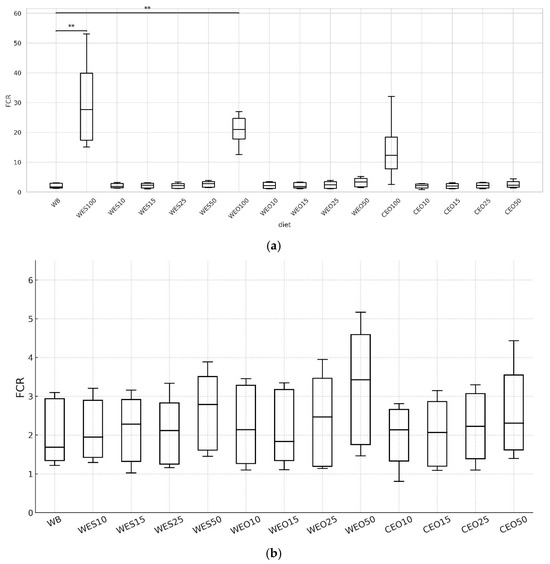 Feed conversion ratio depending on the diet used: (a) FCR for all diets, (b) for all diets except WES100, WEO100 and CEO100. Kruskal–Wallis test: asterisks above brackets indicate significant differences between the compared groups: * p < 0.05, ** p < 0.01, *** p < 0.001. Diet abbreviations: WB: wheat bran; WES10-WES100: wheat bran mixed with enzymatically hydrolysed wheat straw pretreated with steam explosion; WEO10-WEO100: wheat bran mixed with enzymatically hydrolysed wheat straw pretreated using the organosolv method; CEO10-CEO100: wheat bran mixed with enzymatically hydrolysed cup plant pretreated using the organosolv method. The number following each abbreviation indicates the percentage content of the pretreated lignocellulosic material in the diet (in mixture with wheat bran).