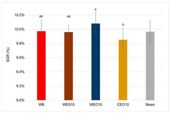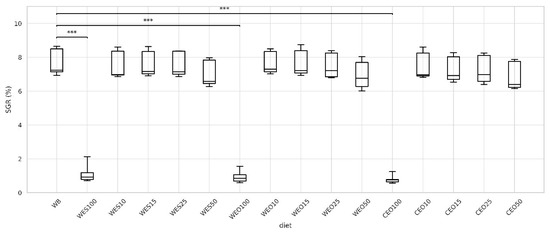 The specific growth rate of larvae reared on the WEO10 diet was significantly the highest, at 10.1% (Figure 9). Larvae reared on the WB and WES10 diets formed an intermediate group in terms of this parameter, with SGR values of 9.97% and 9.96%, respectively. The significantly lowest SGR was recorded for mealworms reared on the CEO10 diet (9.85%).