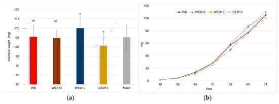 Final individual larva weight (a) and larva weight gain (b) depending on the diet. One-way ANOVA (p = 0.004); whiskers represent standard deviation; a, b, c, etc.: homogeneous groups according to Tukey’s HSD test. Diet abbreviations: WB: wheat bran; WES10: wheat bran and 10% of the enzymatically hydrolysed wheat straw pretreated with steam explosion 10%; WEO10: wheat bran and 10% of the enzymatically hydrolysed wheat straw pretreated by the organosolv method 100%; CEO10: wheat bran and 10% of the enzymatically hydrolysed cup plant pretreated by the organosolv method.