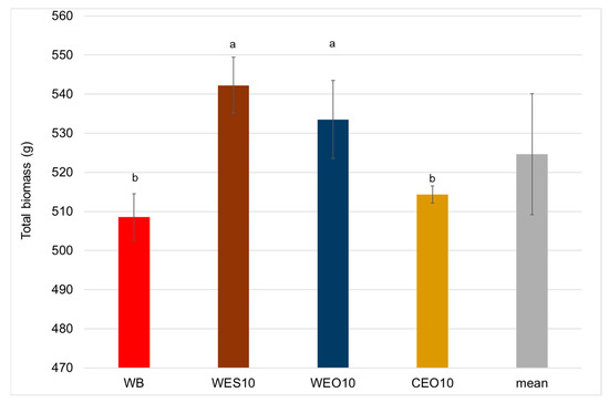 The significantly highest total biomass was recorded for larvae reared on the WES10 and WEO10 diets, amounting to 542 and 533 g, respectively (Figure 8). The use of the remaining diets resulted in significantly lower total biomass, with 514 and 509 g for CEO10 and WB, respectively.