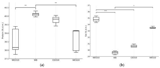 Crude protein (a) and crude fat content (b) (% d.m.) in yellow mealworm larvae depending on the diet. Kruskal–Wallis test: asterisks above brackets indicate significant differences between the compared groups: * p < 0.05, ** p < 0.01, *** p < 0.001. Diet abbreviations: WB: wheat bran; WES10: wheat bran and 10% of the enzymatically hydrolysed wheat straw pretreated with steam explosion 10%; WEO10: wheat bran and 10% of the enzymatically hydrolysed wheat straw pretreated by the organosolv method 100%; CEO10: wheat bran and 10% of the enzymatically hydrolysed cup plant pretreated by the organosolv method.