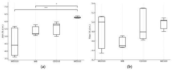The significantly highest crude ash content was found in larvae fed the WES10 diet (6.28% d.m.) (Figure 11a). A statistically similar ash content was recorded in insects fed the CEO10 diet. In contrast, the lowest ash content was found in larvae fed the WEO10 diet (4.40% d.m.). The type of diet did not affect the fibre content in the mealworm larvae biomass (p = 0.059) (Figure 11b). The value of this parameter ranged from 4.50% to 5.03% d.m., for insects fed WB and WES10, respectively.