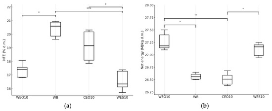 Nitrogen-free extract compounds content (a) (% d.m.) and net energy value (b) (MJ/kg d.m.) in yellow mealworm larvae depending on the diet. Kruskal–Wallis test: asterisks above brackets indicate significant differences between the compared groups: * p < 0.05, ** p < 0.01, *** p < 0.001. Diet abbreviations: WB: wheat bran; WES10: wheat bran and 10% of the enzymatically hydrolysed wheat straw pretreated with steam explosion 10%; WEO10: wheat bran and 10% of the enzymatically hydrolysed wheat straw pretreated by the organosolv method 100%; CEO10: wheat bran and 10% of the enzymatically hydrolysed cup plant pretreated by the organosolv method.