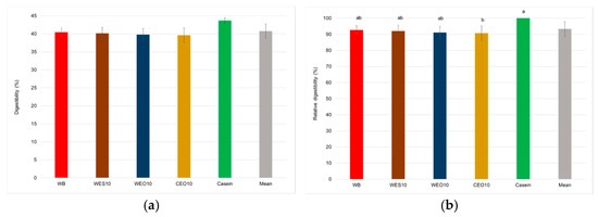 Digestibility (a) (%) and relative digestibility (b) (%), in relation to casein, of yellow mealworm protein depending on the diet. One-way ANOVA (p = 0.044—digestibility p = 0.038—relative digestibility); whiskers represent standard deviation; a, b, c, etc.: homogeneous groups according to Tukey’s HSD test. Diet abbreviations: WB: wheat bran; WES10: wheat bran and 10% of the enzymatically hydrolysed wheat straw pretreated with steam explosion 10%; WEO10: wheat bran and 10% of the enzymatically hydrolysed wheat straw pretreated by the organosolv method 100%; CEO10: wheat bran and 10% of the enzymatically hydrolysed cup plant pretreated by the organosolv method.