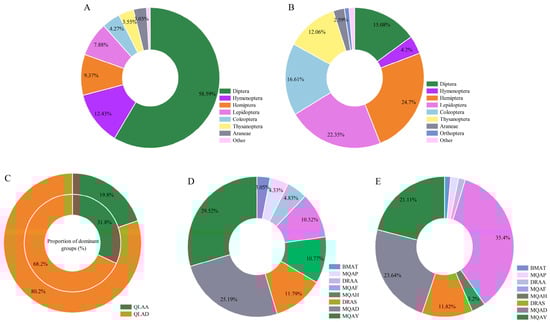 Percentage of dominant groups in different sampling sites. Note: (A,B) distributions represent the proportion of dominant pest categories of each order in Golog Tibetan Autonomous Prefecture and Haibei Tibetan Autonomous Prefecture, respectively; and other represents taxa with a proportion of less than 1%. (C) is a comparison of the number of Diptera (outer circle) and Hemiptera (inner circle) within the two sampling sites in Haibei Tibetan Autonomous Prefecture, and (D,E) is the proportion of insects in the dominant taxa of Hemiptera and Diptera in Golog Tibetan Autonomous Prefecture, respectively, in the respective sampling sites, and the labels with proportions of less than 2% are hidden.
