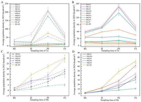 Dynamic analysis of T. angustipennis (Ta) and M. cinxia (Mc). Note: (A,B) illustrate the average population density of Ta across different sites in 2023 and 2024, respectively. Similarly, (C,D) depict the average population density of Mc in various sites during the years 2023 and 2024. The population size of the Ta and Mc in the LS is not shown in the figure because during LS in either year, no such pests were detected in any of the experimental fields.