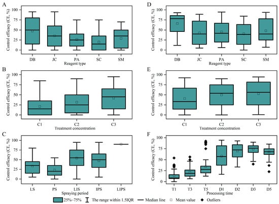Comparison of prevention and treatment effects under different treatments. Note: left (A–C) is the result of a pot experiment, and right (D–F) is the result of field experiment.