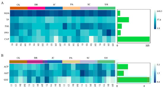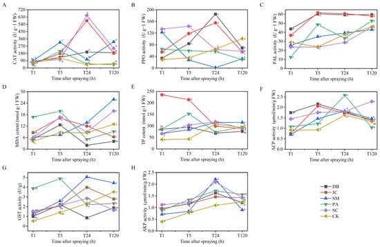Pesticide treatments significantly affected floral receptacle enzyme activity and secondary metabolite levels (p < 0.05). Within 24 h, all CAT, PPO, and PAL activities were boosted, plus MDA and TP content (Figure 5A–E). DB and JC treatments strongly enhanced antioxidant (CAT) and phenylpropanoid (PAL, PPO) pathways, boosting metabolite (e.g., TP) accumulation and defence. SC and SM treatments caused transient, specific activity peaks (e.g., 48 h) with generally lower intensity than DB and JC (p < 0.05). MDA elevation at 5 h, followed by fluctuations, signified persistent oxidative stress. Enzyme activities and metabolite levels in all treatment groups remained significantly higher than in the water control (CK), confirming systemic activation of plant defence mechanisms under chemical stress.