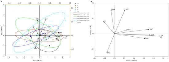 PCA (A) and factor (B) analysis of plant and pest resistance indicators and control effectiveness under different treatment agents.