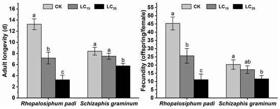 The adult longevity and fecundity of Rhopalosiphum padi and Schizaphis graminum F0 generation under control conditions (CKs), treated with LC15 and LC35 concentrations of cyclaniliprole. Different letters indicate significant differences (p < 0.05).