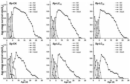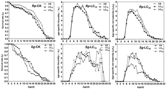 The sxj of R. padi and S. graminum F1 generation are presented in Figure 2. In the control group, the maximum sxj values for 2nd, 3rd, and 4th instar nymphs and adults were 0.73, 0.63, 0.78, and 0.93, respectively. In contrast, under the LC15 and LC35 treatments, the maximum sxj values for the corresponding stages were reduced to 0.64 and 0.64 (2nd), 0.51 and 0.49 (3rd), and 0.52 and 0.54 (4th), as well as 0.83 and 0.85 (adults), respectively, indicating that sublethal exposure (LC15 and LC35) decreased sxj of R. padi F1 generation (Figure 2). For S. graminum F1 generation, LC15 and LC35 concentrations of cyclaniliprole had no significant effects on sxj (Figure 2). Additionally, sublethal exposure (LC15 and LC35 in R. padi; LC35 in S. graminum) significantly reduced the lx and lxmx, whereas mx showed no significant difference in the F1 generation of either species (Figure 3).