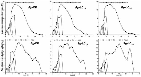 Age-stage-specific reproductive rate (vxj) of Rhopalosiphum padi and Schizaphis graminum F1 generation under control conditions (CK) treated with LC15 and LC35 concentrations of cyclaniliprole. Rp, Rhopalosiphum padi; Sg, Schizaphis graminum; N1, first nymph stage; N2, second nymph stage; N3, third nymph stage; N4, fourth nymph stage.