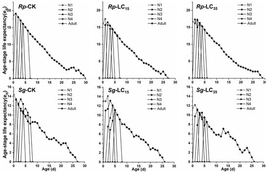 Age-stage-specific life expectancy (exj) of Rhopalosiphum padi and Schizaphis graminum F1 generation under control conditions (CK), treated with LC15 and LC35 concentrations of cyclaniliprole. Rp, Rhopalosiphum padi; Sg, Schizaphis graminum; N1, first nymph stage; N2, second nymph stage; N3, third nymph stage; N4, fourth nymph stage.