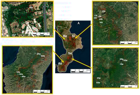 Meteorological data were collected from eight weather stations (ARPACAL: https://www.cfd.calabria.it/index.php/dati-stazioni/dati-storici, accessed on 10 January 2023) located near the 17 study sites (Figure 1; Table 2). During the study period, the highest mean temperature of 16 °C was recorded at the lowest elevation site (220 m a.s.l.), while the lowest mean temperature of 6.5 °C was observed at the higher elevation sites (1720 and 1820 m a.s.l.). The lowest recorded temperature was −14.9 °C (5Si; 6Si) in winter, and the highest recorded temperature was 42.7 °C (1Re) in summer. Precipitation, occurring as both rain and snow, was concentrated in the autumn and winter months. The highest average precipitation of 159.2 mm was recorded at 1As (912 m a.s.l.) and 2As (979 m a.s.l.), while the lowest average precipitation of 76.4 mm was recorded at 1Si (1140 m a.s.l.).