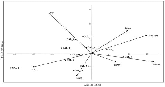 The canonical correspondence analysis (CCA) performed on a matrix of species from the family Calliphoridae collected from the sites listed in Pezzi et al. [] and another matrix of the environmental variables listed in Table 1. Arrows represent the environmental variables. For abbreviations of variables, see Table 1. Species abbreviations: CAL_1, Calliphora vomitoria; CAL_2, C. vicina; CAL_3, Lucilia caesar; CAL_4, L. ampullacea; CAL_5, L. sericata; CAL_6 Chrysomya albiceps; CAL_7, C. rohdendorfi; CAL_8, Protocalliphora azurea; CAL_9, Melinda gentilis Robineau-Desvoidy, 1830; CAL_10, Onesia floralis Robineau-Desvoidy, 1830; CAL_11, Eurychaeta muscaria (Meigen, 1826).