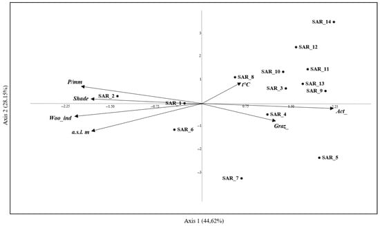 Environmental variables used in canonical correspondence analysis (CCA): altitude (m a.s.l.), grazing degree, human activities degree, shade degree, forest cover index (the proportion of the area under forest relative to the total area of a given territory, expressed as a percentage), average seasonal temperature, (e.g., average, minimum, and maximum seasonal temperatures), and average seasonal rainfall (in millimeters).